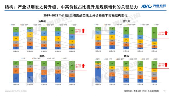 厨卫刚需品类长久以来经历过价格内卷、高配低价等乱象,目前产业结构在618呈现快速升级态势。数据显示,今年618,线上油烟机、燃气灶、电热、燃热分别以3000元、1700元、2000元、3500元以上价格段增长最为显著,从5年长周期来看,似乎是“蛰伏”已久的爆发式升级。