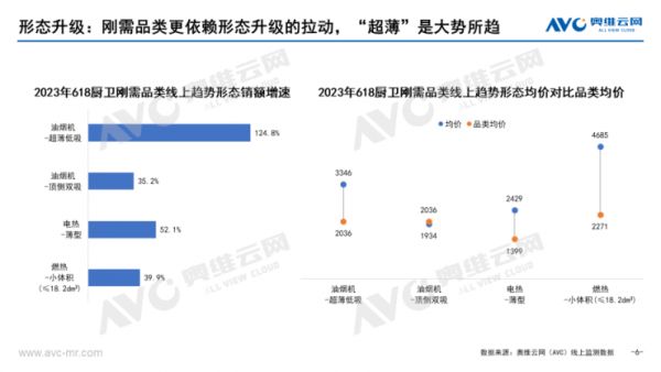 形态升级也在有效拉动刚需品类的规模发展。今年618期间,超薄烟机、薄型电热水器、小体积燃气热水器线上销额增速分别为124.8%、52.1%、39.9%,增长势猛,且均价和行业均价拉开较大的差距。“超薄”化已成为厨卫刚需品类目前迭代的重要方向。