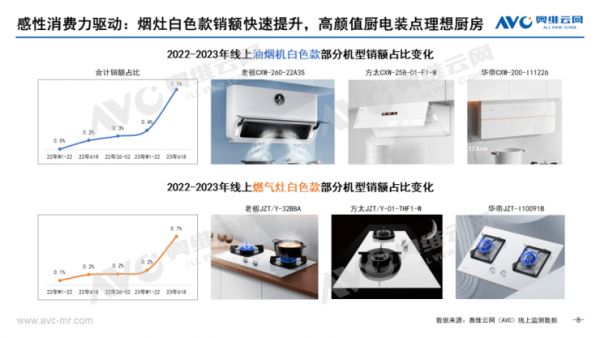 有设计感的外观也带来溢价及市场空间,各品牌也相继入场。618期间白色款烟灶的多个机型销额占比明显增长,“奶油风”厨房的装修风格,一度击中消费者的审美。