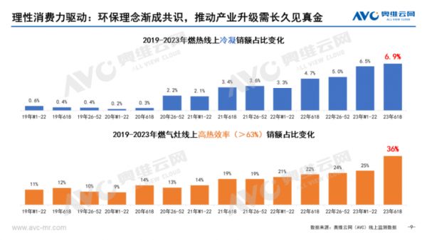 理性消费力体现在消费者对更加高效环保的性能的产品的支持。高热效率(>63%)的燃气灶在今年618线上销额占比快速提升。冷凝式燃气热水器在则是在长周期内保持着稳定且缓慢的增长,环保理念对产业升级的推动更是一个长久的过程。