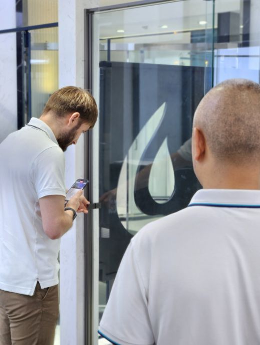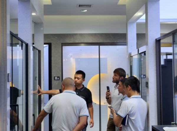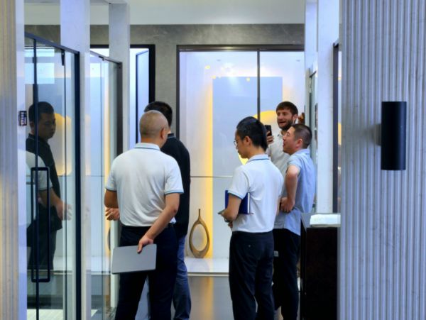 在法兰浴王工作人员的陪同下,国外客户一行人来到公司展厅,参观了淋浴房、阳台柜、全景门、壁龛等产品。工作人员也详细讲解产品设计、性能,以及卫阳整装定制优势。