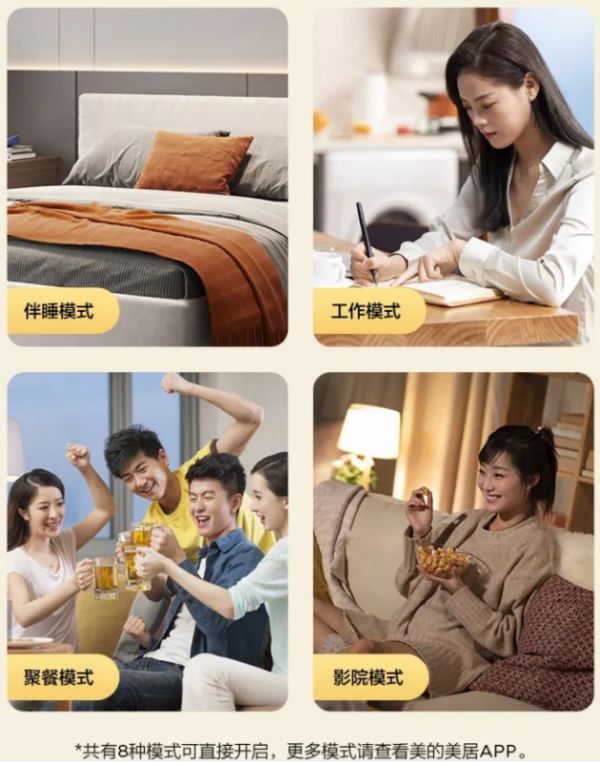 作为接近阳光的全光谱吸顶灯,iCare自然光系列可根据当地日出日落变化,在美的美居APP设置让灯光随时间变化,通过灯光的色温和亮度变化,调节人们的昼夜节律。早上7点,iCare吸顶灯会仿日出光缓亮,开启美好一天;中午12点,它会仿日光色温变冷,提高工作学习专注度;深夜10点,它会仿月光亮度开小夜灯,促进人体褪黑素的分泌,让用户放松身心准备入睡。除此以外,iCare自然光系列还具有伴睡模式、工作模式、聚餐模式、影院模式等8种场景模式,用户可在美的美居APP上随时切换。