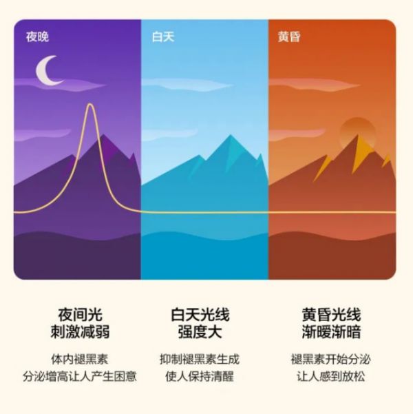 褪黑素是重要的身体激素之一,它白天分泌受到抑制,晚上分泌活跃、促进睡眠,对于人体有明显的昼夜调节作用。而自然光的色温与强度变化,是影响褪黑素分泌的关键因素之一,因而室内光线若能按照自然光线一样变化,有助于人们形成规律的作息习惯。