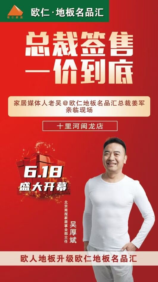 6月18日,恰逢父亲节,在这个特殊又有意义一天,欧仁·地板名品汇闽龙广场店盛大开幕。现场,欧仁家居总裁姜军亲临现场进行签售,与一众新老顾客相约,带来一“价”到底的福利。