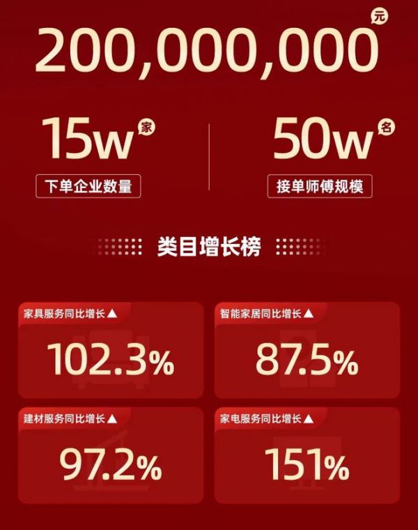 据相关数据显示,今年“618”大促期间,鲁班到家交易额位居安装售后服务领域TOP1,6月1日-18日交易规模达200000000元,下单企业超过15万家,接单师傅规模超50万名;家具服务、智能家居服务、建材服务、家电服务等多个类目同比增长接近或超过100%。以下为“鲁班到家618战报”:网址:再破纪录!鲁班到家618安装售后交易额超2亿元 ,15W企业下单 50W师傅接单 https://www.jiaju82.com/news-view-id-847700.html