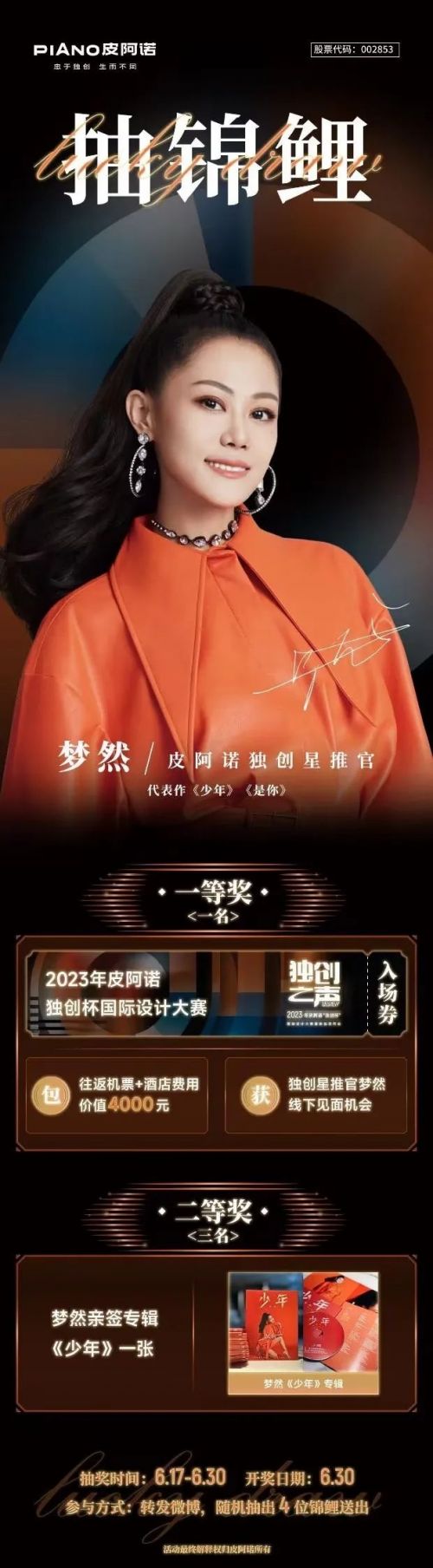 关注皮阿诺官方微博,带话题#忠于独创 生而不同#转发抽奖微博,6月30日将抽取1名幸运锦鲤送出2023皮阿诺国际设计大赛现场门票(包价值4000元,往返机票+酒店住宿费用,与梦然线下见面机会)和3名幸运锦鲤送出梦然签名专辑《少年》一张。
