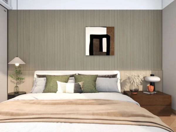 主卧空间种,雅琪诺采用上下双层床头背景的设计,上层是MM30603M细格栅,层次丰富、效果灵动,而下层MM30603木纹墙咔,简约而有质感。主卧墙面选用YDS010149成品艺术涂料砂粒系列,让空间纹理层次更为细腻丰富。雅琪诺打造了斑驳、不平整的墙面质感,这正是营造侘寂风的一大要素,是拙朴、自然、粗野、原始的最好诠释,也代表了记时间的流转,记忆的斑驳。