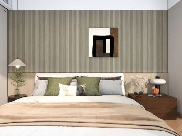 主卧空间种,雅琪诺采用上下双层床头背景的设计,上层是MM30603M细格栅,层次丰富、效果灵动,而下层MM30603木纹墙咔,简约而有质感。主卧墙面选用YDS010149成品艺术涂料砂粒系列,让空间纹理层次更为细腻丰富。雅琪诺打造了斑驳、不平整的墙面质感,这正是营造侘寂风的一大要素,是拙朴、自然、粗野、原始的最好诠释,也代表了记时间的流转,记忆的斑驳。