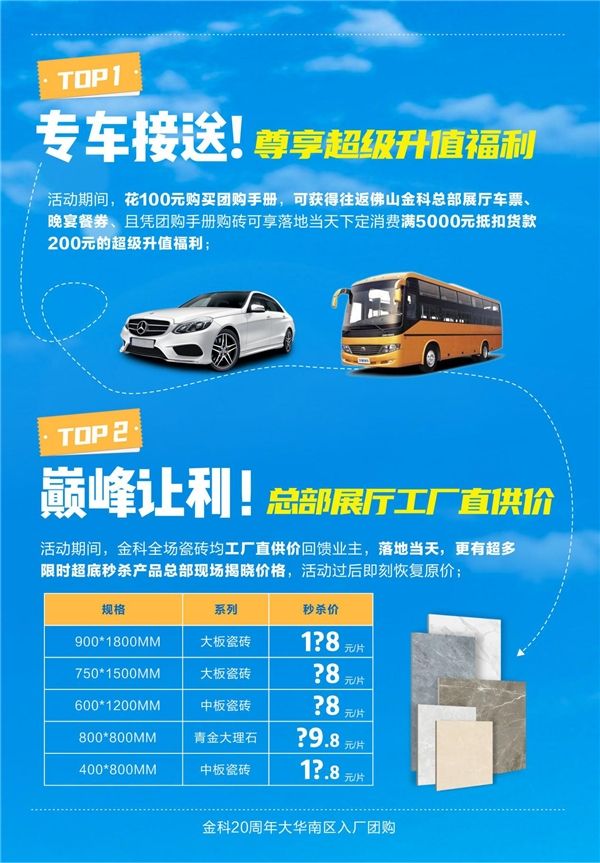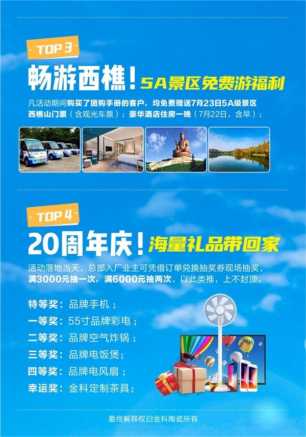 本次活动不仅有总部推出的巅峰让利,豪礼抽奖之外,更是创新地将活动落地形式从原来的单日返往纯购物式落地更改为两天一夜购物+旅游式落地。让广大业主朋友来佛山不仅能够厂价购金科品质好砖,更能够借此领略国家5A级景区佛山西樵山的风采。