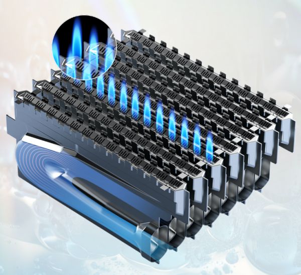 因此,只有减少燃烧火排个数、降低燃气压力才可以降低水的温升。而减少燃烧火排个数并不是意味着“开小火”。由于热水器本身是瞬间加热,再加上高强度燃烧设计结构,因此“小火”燃烧反而比较困难。当万和的AI微焰燃烧技术,配合创新的V型交叉混合射流燃烧器工作时,既可为超低负荷燃烧提供稳定温度,也能为燃气热水器低温升出水提供支撑,实现低温升用水的精准控制。