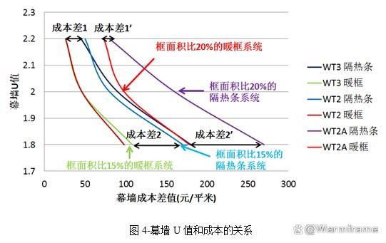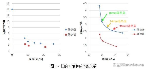 ③ 比较有机隔热系统和暖框系统的性价比,当成本相同时,后者框的U值比前者平均降低45%;当框的U值相同时,后者的成本仅为前者的1/3。