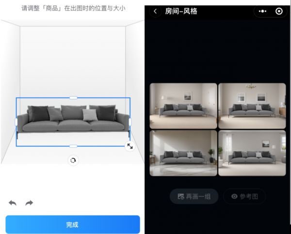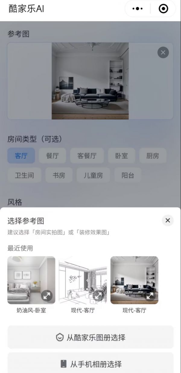 “酷家乐AI”创作的形式为“图生图”和“文生图”,可实现根据实景图生成装修效果图、户型图生成创意方案、AI一键替换商品场景等功能,满足业主、设计师和门店导购三大场景需求。