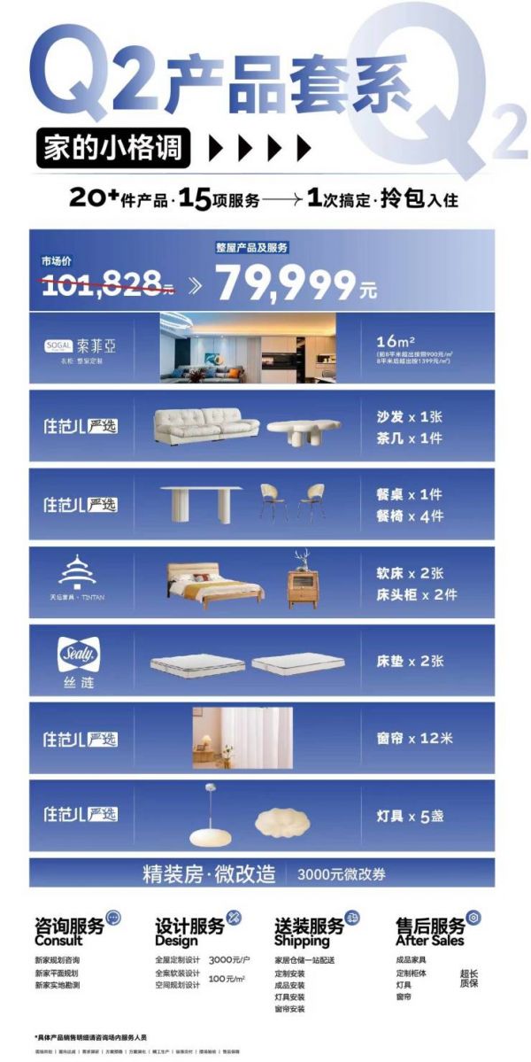 与为满足引流需求的标准化,固定化的套餐不同,依托线下2万平米的“超级家居MALL”,住范儿整家定制套餐可进行灵活的单品升级,在推出的Q1、Q2、Q3、QS四个系列套餐中,当消费者有意对套餐系列中的某种品类进行更换和升级,住范儿可灵活进行增减选配,以成本价加价的形式充分实现业主的个性化装修需求,打破了标准化套餐中品牌、品类、设计和场景的壁垒之后,套餐的转单效应和加购效应也将得到充分释放。