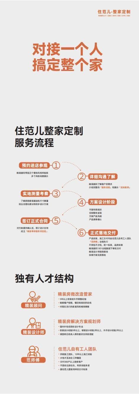 住范儿对设计团队的精细打造,成为构建这套灵活的、一站式整家定制业务的要点。当对精装房的服务标准不断拉高,为保障高水准的设计,住范儿组建了1+N+N的服务团队,1名精装顾问,N名配合团队,N套系统解决方案。住范儿以客户需求为导向,以专业流程做出有温度的、灵活的解决方案,而不是单纯的卖东西。