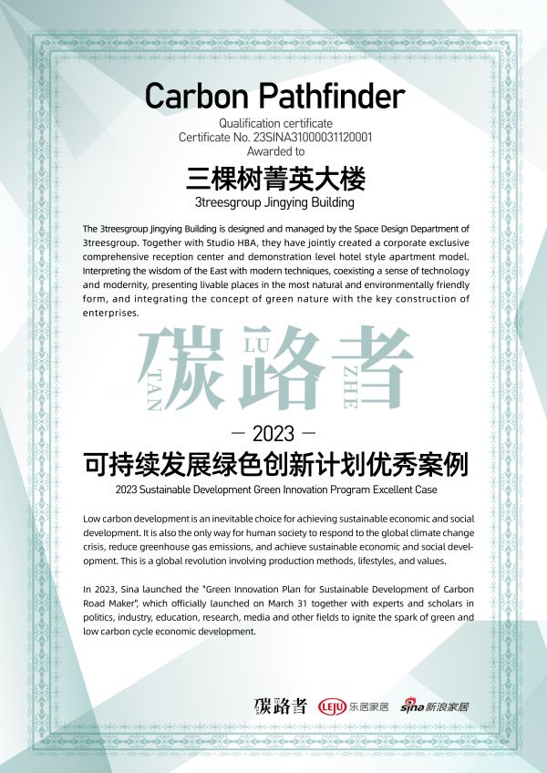 此次入选“碳路者 2023可持续发展绿色创新计划”优秀案例的三棵树菁英大楼作为一个生态化绿色低碳可持续共生空间,力求做到每个细节更绿色、更低碳,全方位展示三棵树绿色、无味、无醛、无毒、高科技的一站式健康产品,以实际行动为环境健康、社会文明进步、行业良性发展、消费者的健康生活作出应有的贡献。