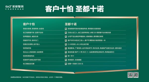 为了切实保障消费者权益,圣都家装立足客户需求、解读客户痛点,不断从企业自身开刀,向品质服务发力,针对此前发布的“十怕十诺”承诺,圣都直接将承诺细则写入合同,从签单、选材、施工、到交付、售后,涉及全服务过程,例如:客户怕恶意增项,我们承诺恶意增项直接免除;怕工程质量不好,品质不达标,承诺20项质量不达标砸无赦;怕:材料假冒伪劣,我们承诺假一罚十;客户怕延期,我们承诺延期一天赔付200元等,将客户的担忧直接纳入法律保障内,为客户打造更具有确定性的品质装修。