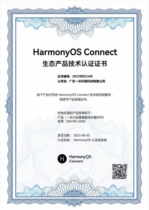 2023年6月2日,一米净水器成功通过鸿蒙HarmonyOS Connect生态产品技术认证。成功实现与华为智能生态产品的互联互通,一米净水器的用户,可通过“华为智慧生活”APP实时远程掌握家中净水情况、查看滤芯状态、一键冲洗等,拥有更简捷、流畅、连续和安全可靠的全场景交互体验。