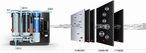过滤原理采用PSA折叠膜活性炭阻垢复合滤芯+反渗透RO膜+CTO烧结活性炭,能够有效过滤水中铁锈、泥沙、余氯、细菌、病毒、重金属等有害物。