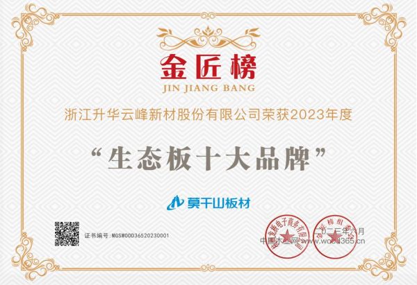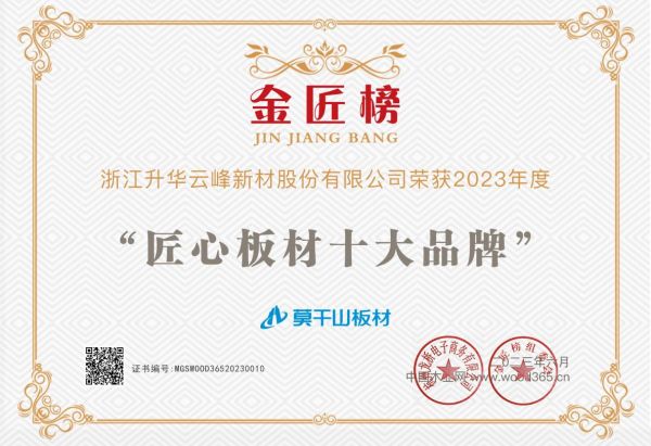 本次颁奖典礼中,云峰莫干山以卓越实力,一举揽获“生态板十大品牌”、“行业影响力板材十大品牌”、“匠心板材十大品牌”三项大奖。这既是对云峰莫干山专业研发能力和强大品牌力量的肯定,也进一步彰显了云峰莫干山持续助力家居行业发展的企业实力和信心。