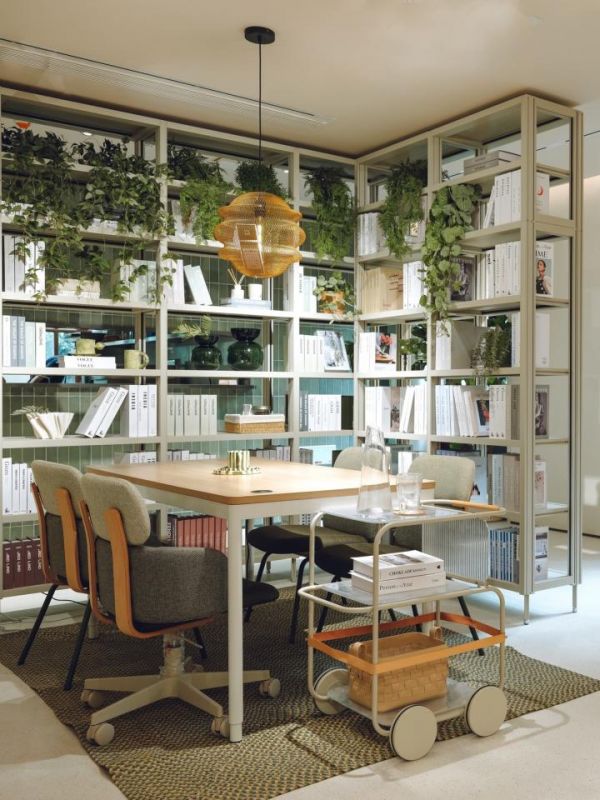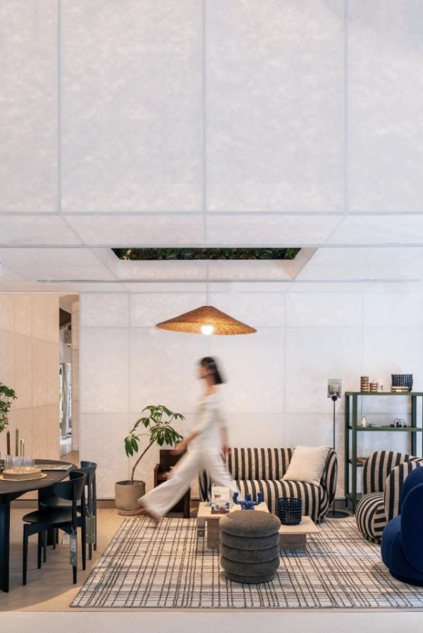 一步一景,章回首家线下门店通过庭院游览的沉浸互动形式,创作出以多个生活篇章为主题的体验空间。整个设计在城市绿洲(Urban Oasis)、花园餐厅(CINCIN Garden)、Homie客厅(Homie Space)、本色之间、疗愈花园(Healing Garden)五大“章回”中,植入包括“氛围感微醺”、“宅家露营观影”、“与喵同住”、“家庭图书馆”等在内的生活趋势新篇章。在一楼中庭,以绿植为主体的艺术装置打通建筑两层天井,犹如嵌入城市肌理中的垂直森林,在钢铁水泥构筑的高压都市生活中拔地而起,创造让人意料之外的惊喜。