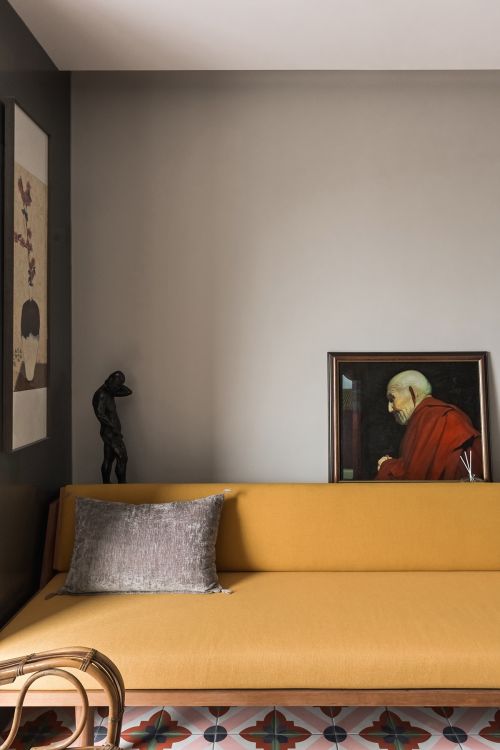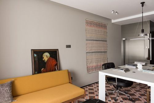 鹅黄色的daybed沙发和年代久远的手工藤编椅围合成了一个小型区域,是交谈和放松的好位置。不锈钢模块上的两个90°转角处,设计师巧妙地切开了小口,并在里边严丝合缝地置入两组镜子,不仅弱化了模块在视觉上的重量,还丰富了空间的观察视角,给采光不佳的内部空间带来了趣味和活力。