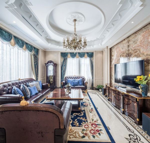 入户大门考虑风水位置调整格局,每个角度均能欣赏豪宅的美感。进到空间内,豪门是第一视觉。整体将以欧式古典为基调,大理石背景墙铺陈,造空间细节缤纷之美。深紫色皮质沙发配置蓝色纹理抱枕,时尚奢华的风格满足客户对生活品质的追求。部分金属的点缀让客厅仪式感满满。“设计师陈智龙特别细心,无论是整体施工,还是软装配饰,在细节方面都达到了完美极致,让家里非常温馨。”黛绿花鸟装饰搭配双鹤金属底座,与窗帘黛绿色相得益彰,凸显空间层次感高级感,让古典韵味越发浓烈。