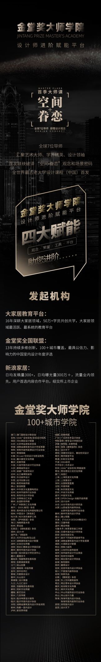 金堂奖大师学院由大家居教育平台、金堂奖、新浪家居共同发起,联合100+金堂奖各地城市学院,首季大师课汇聚全球七位导师,包括艺术大师、学界精英、设计领袖,首次破译“空间·眷恋”空间场景密码,以业主时间体验丈量空间设计价值,认为设计的本质是对业主在空间里的时间规划——家,不是一个地方,而是一段时光……