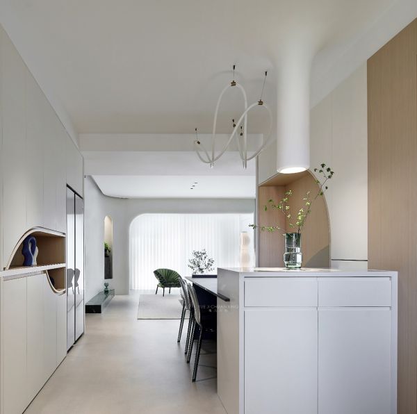 餐厅由于是入户到客厅卧室的必经之路,为了保持过道空间有一定行走的舒适度,将餐桌移至靠右,将过道更大程度的预留出来,由于户型原因餐桌的岛台下设计师巧妙的将其设计为室内鞋柜,更加方便日常生活使用。