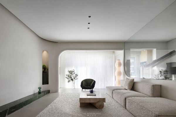 我们用留白的空间借以一抹绿色作为点缀,给予空间生机与活力,圆弧曲线能带给人温润柔和之感,因此于内部结构避免锐角设计,采用圆弧元素框构廊道、壁面、吊顶轮廓,藉以带出线条圆融安定与流动之美。