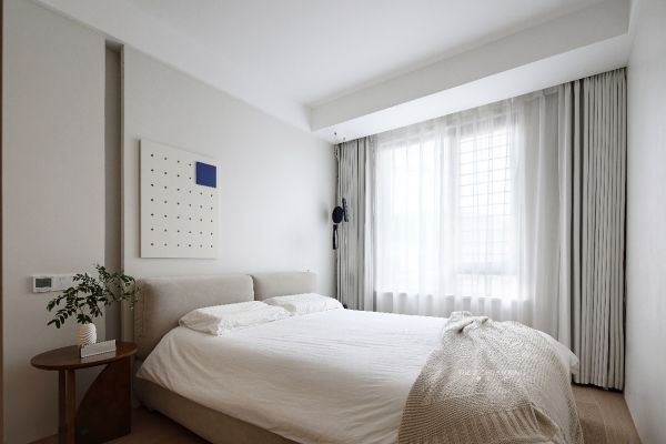 主卧的弧顶给原有飘窗下沉梁位的锐利感带来完美的修饰,主卧背景和蓝色的几何体块与客厅遥相呼应,突出了整体的设计主题性,主卧地台床给整体的居家生活带来慵懒感。主卧与衣帽间做了长虹玻璃移门隔断,为此给衣帽间带来采光,又能将两个空间区分开来。由于原建筑主卫在两堵承重墙中间空间受到限制,设计师将其设计成干湿分离,将卫生间干区与衣帽间共用。
