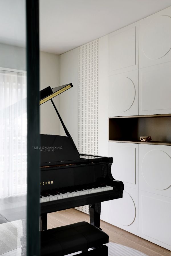 由于客厅与钢琴房设计成半通透式的大玻璃隔断,突破了传统的沙发背景的设计,而设计师将钢琴房背后的柜子做了不同造型面上的几何叠底,即为业主增加了储物空间,又丰富了两个空间的背景元素。