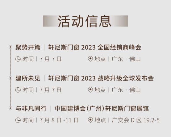 2023年7月8日-7月11日,轩尼斯铝合金门窗诚邀您莅临广州琶洲国际会展中心D区19.2-05,共鉴世界顶尖美学匠心之作,重新定义极简美学与艺术生活!