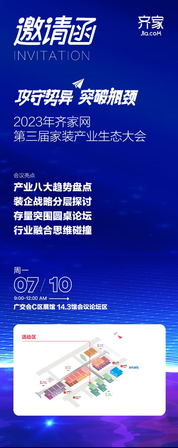 带着这些问题,2023年7月10日,齐家网将举办以“攻守势异,突破瓶颈”为主题的齐家网第三届家装产业生态大会,该大会将在中国建博会(广州)主场馆召开,大会由新浪家居、优居视界、腾讯家居•贝壳等媒体战略支持,届时将邀请建博会领导、知名建材品牌商、权威行业专家以及家装产业链各环节头部企业等共计200余人次,就低增长时代的行业破局之道进行深度研讨和跨界对话,与各类行业大咖一道共同探寻有效的解决方案。