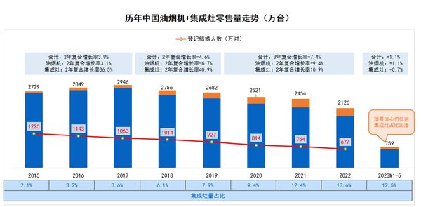 同时,据奥维云网数据(AVC)显示,一方面,登记结婚人数逐年递减,这对于偏新房用户群体的集成灶市场来说并不友好,另一方面,从2015年至2023年5月集成灶每2年复合增长率从最高的40.9%回落至10.9%,增速逐步放缓,而油烟机每两年复合增长率则减速放缓。依照此趋势,短期内分体式厨电则更占优势。