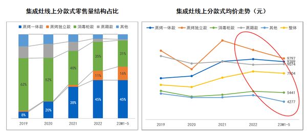 通过奥维云网图示可看出,2023年1-5月集成灶线上分款式零售量结构占比与2022年相比并无太大差异,蒸烤类款集成灶的扩容减缓导致结构拉力减弱,并且均价整体呈现下探趋势,价格内卷逐步暴露。