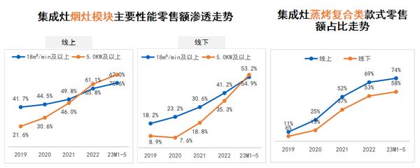 在中国厨房面积不足且用户需求日益多元化的当下,集成乃大趋势。据奥维数据显示,集成灶烟灶模块主要性能零售额渗透走势逐步攀登,风力、火力、降噪、一级能效等性能要求愈发高涨;集成灶蒸烤复合类款式零售额占比走势也在增长,证明用户对功能需求愈发广泛。