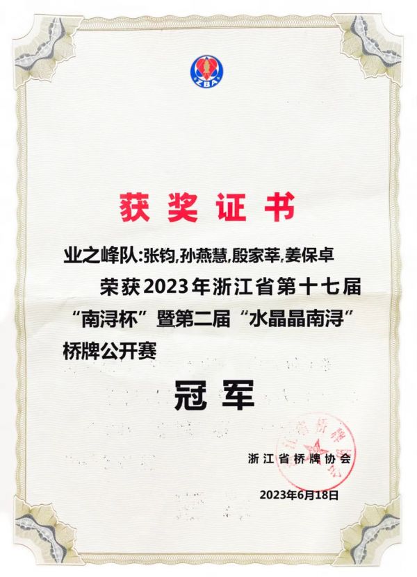 第四冠 业之峰获得“南浔杯”桥牌公开赛冠军