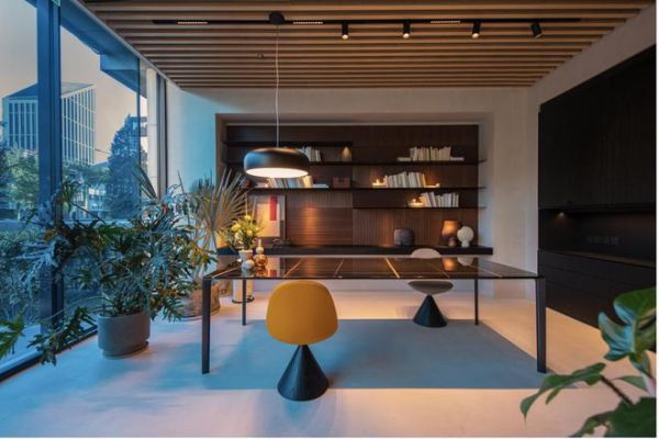 Piero Lissoni延续其极简理念,用系统家具的纯粹形态和⼴泛饰⾯为展厅空间糅合了中性与精致的色调。由意⼤利设计⼤师Bruno Munari于1966年设计的Porro品牌标识以橱窗图形元素⾯向街道,在透明玻璃门窗下如同一盏霓虹灯,让室内变成⼀个透明发光的盒⼦。