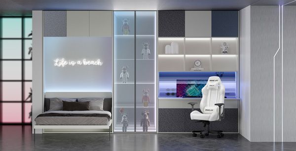 曲美家居为年轻人设计的电竞房,拥有隐藏式床,美观便捷;提供隐藏式收纳书桌,同时设计了专属的手办玩具柜、可调节的桌腿设计、可升降控制的电脑屏幕,适合不同成长阶段的需求。成长的专属空间不仅能容纳远大的求学志向,也能抚慰疲惫的心灵,安放更多独处的空间。