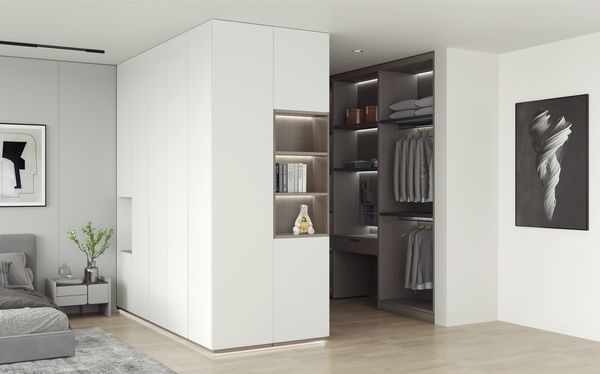 本次建博会上同样将展出属于曲美家居B8系列的卧室空间,独特的双面衣柜让收纳翻倍,小小的空间满足大大的储物需求,曲美家居还精心设置了遥控功能,时尚又便捷。此外,衣柜的柜门还专门做了有小心思的处理,让衣柜秒变书房和妆台。