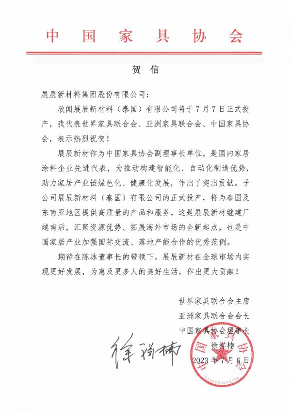 祝贺泰国展辰,良辰吉日开业红火兴旺!感恩诸位嘉宾莅临现场,感谢中国涂料工业协会、中国家具协会、中国木材与木制品流通协会等来自国内外各界的贺电祝福!展辰新材将不负信赖与托付,继续与各界伙伴携手并肩,用心谱写发展新篇章,共赴美好新未来!