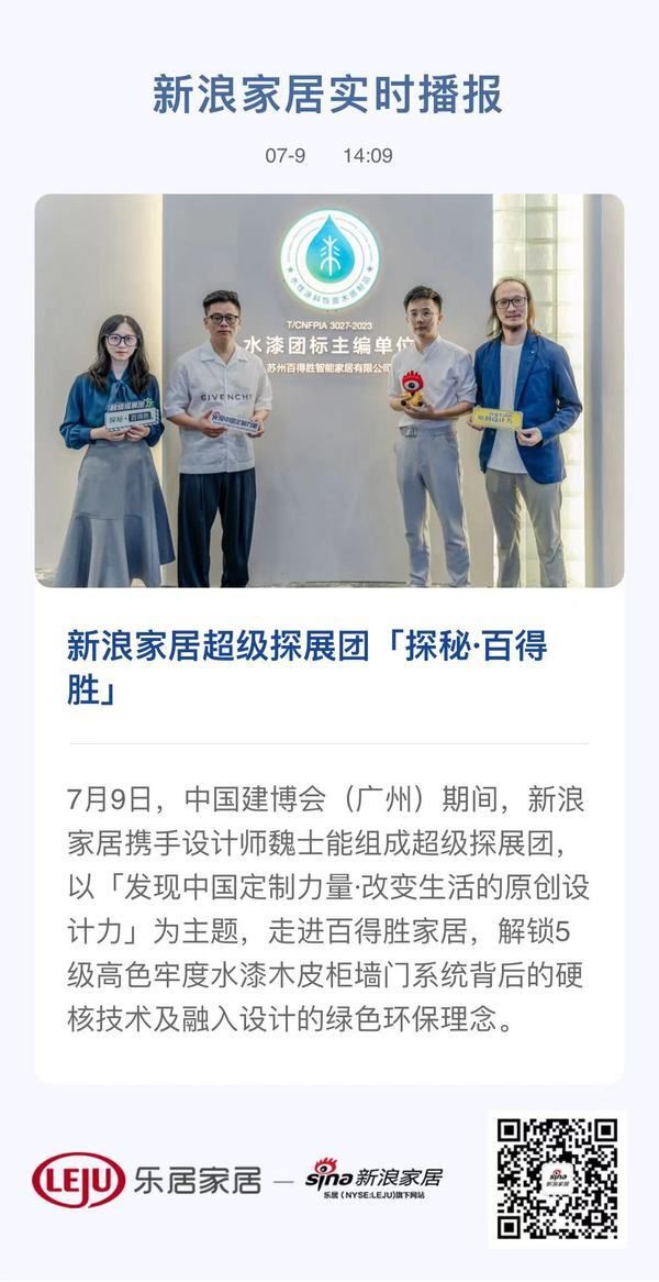 7月9日,中国建博会(广州)期间,新浪家居携手设计师魏士能组成超级探展团,以「发现中国定制力量·改变生活的原创设计力」为主题,走进百得胜家居,解锁5级高色牢度水漆木皮柜墙门系统背后的硬核技术及融入设计的绿色环保理念。