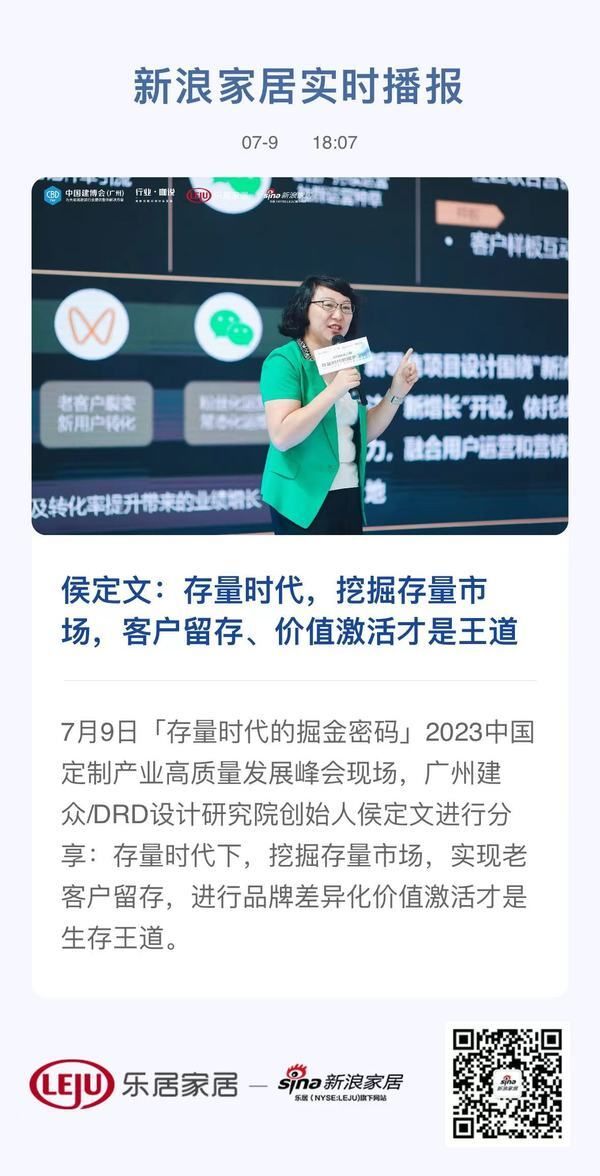 7月9日「存量时代的掘金密码」2023中国定制产业高质量发展峰会现场,广州建众/DRD设计研究院创始人侯定文进行分享:存量时代下,挖掘存量市场,实现老客户留存,进行品牌差异化价值激活才是生存王道。