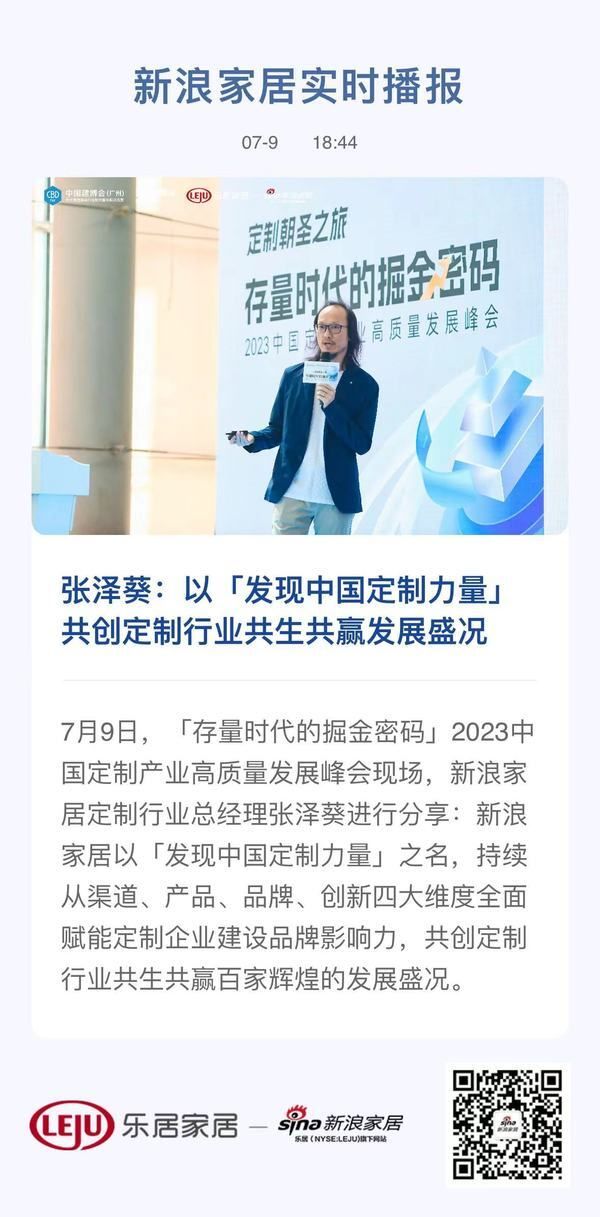 7月9日,「存量时代的掘金密码」2023中国定制产业高质量发展峰会现场,新浪家居定制行业总经理张泽葵进行分享:新浪家居以「发现中国定制力量」之名,持续从渠道、产品、品牌、创新四大维度全面赋能定制企业建设品牌影响力,共创定制行业共生共赢百家辉煌的发展盛况。