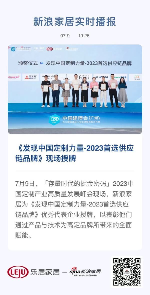 7月9日,「存量时代的掘金密码」2023中国定制产业高质量发展峰会现场,新浪家居为《发现中国定制力量-2023首选供应链品牌》优秀代表企业授牌,以表彰他们通过产品与技术为高定品牌所带来的全面赋能。