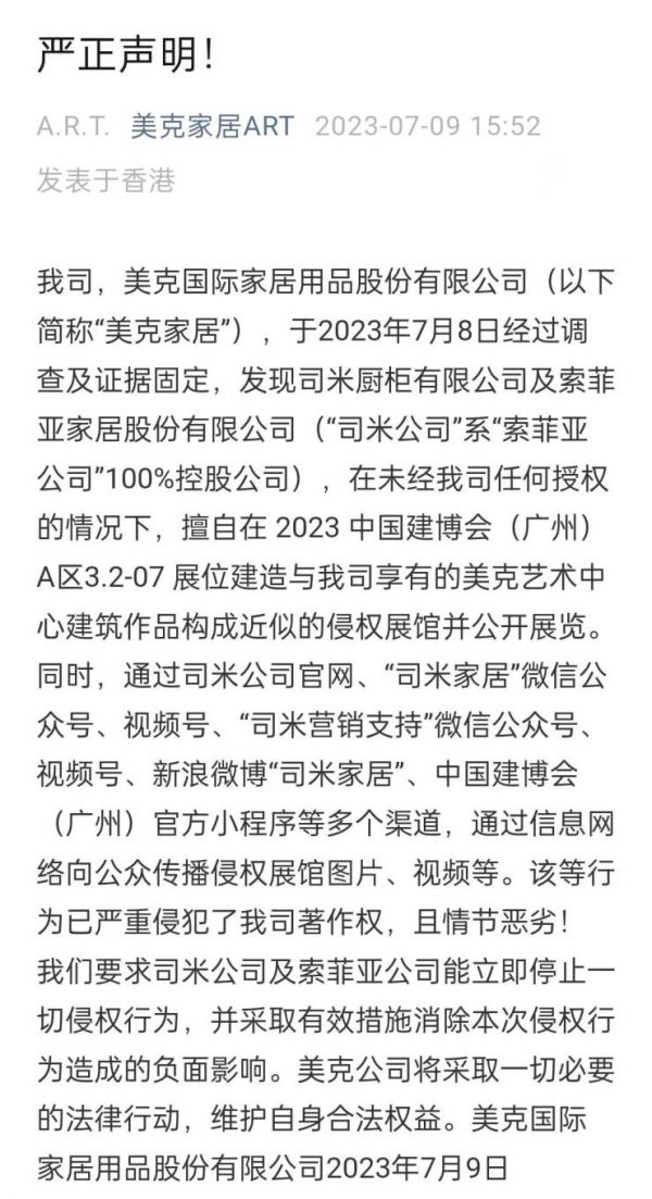 2023广州建博会7月8日启幕前,疑似侵权的展馆便已在法国司米线上官方微信等平台进行了宣发传播,截止发稿前,美克家居及美克洞學館也已通过官方渠道进行了严正声明。