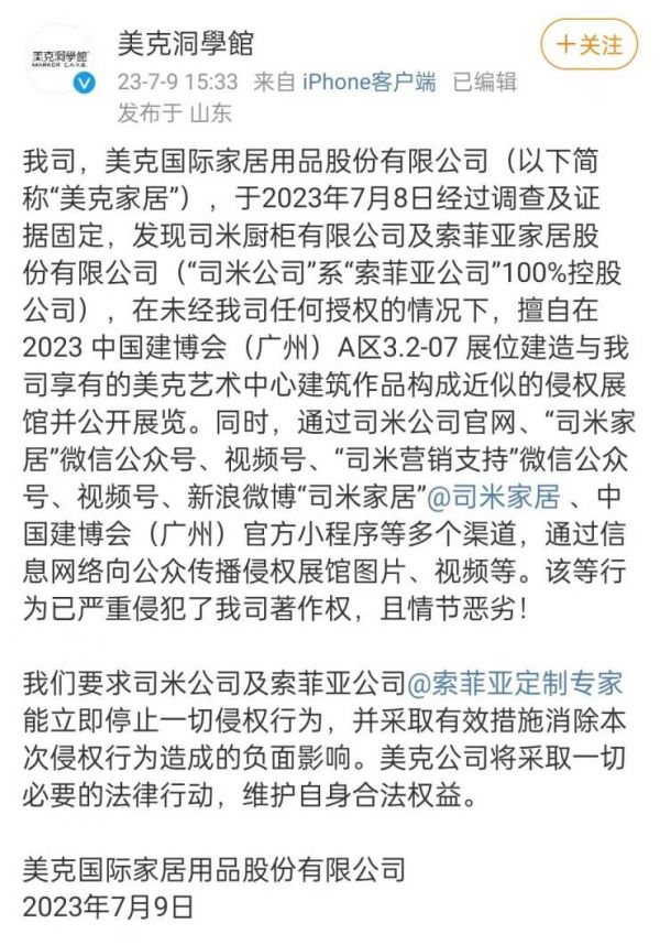 美克洞學館表示,要求司米公司及索菲亚公司@索菲亚定制专家 能立即停止一切侵权行为,并采取有效措施消除本次侵权行为造成的负面影响。美克公司将采取一切必要的法律行动,维护自身合法权益。