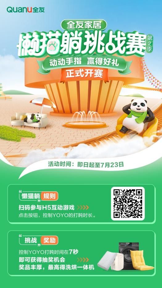 为增强活动趣味性,全友还特别在线上线下同步发起了“全友懒猫躺”趣味游戏。线上以趣味H5为载体,邀请用户参与互动,操纵“YOYO”打盹赢取丰厚奖励;线下,用户可前往全友任一门店,在软体产品上躺下,不借助任何计时工具,闭眼“盲躺”60秒,在规定时间内“盲躺”成功的用户即可获得对应的奖品奖励。
