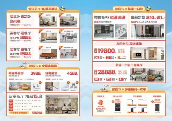 为进一步促进消费回暖,全友年中大促惊喜来袭,“全友懒猫节”第二季火热进行中!本次活动以覆盖全屋客卧空间的超值优惠套餐和钜惠钜划算的惊喜福利回馈消费者,让你赢在家装起跑线,软装、设计、定制一站式服务,快速、便捷、省心省力,轻松坐享理想家。