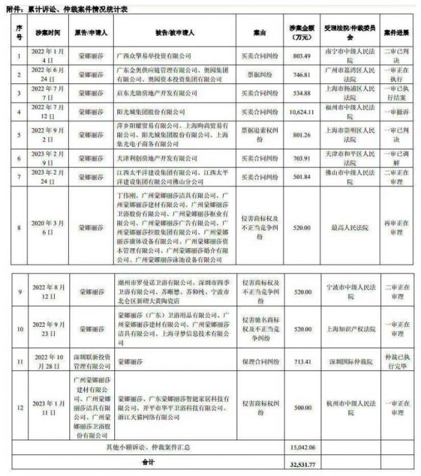 蒙娜丽莎(002918.SZ)公告称,截至2023年7月5日,公司及控股子公司连续十二个月内累计发生的诉讼、仲裁事项涉案金额合计为人民币32,531.77万元,占公司最近一期经审计净资产的10.01%。其中,公司及控股子公司作为原告涉及的诉讼、仲裁案件金额合计为人民币30,627.95万元,公司及控股子公司作为被告涉及的诉讼、仲裁案件金额合计为人民币1903.82万元。